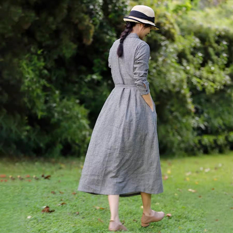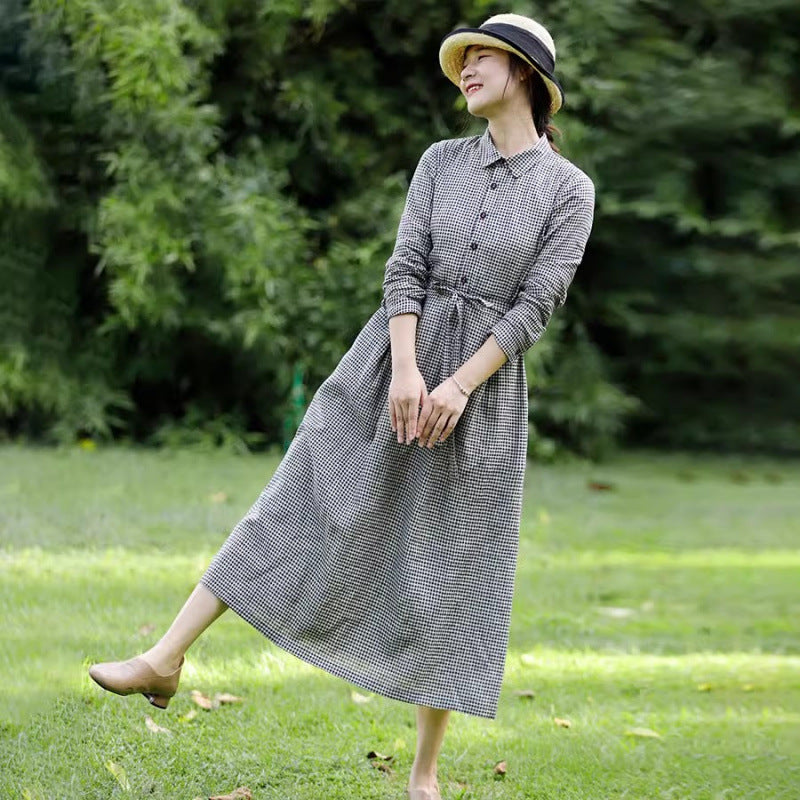 Export last order 4 autumn new retro literary plaid cotton and linen dress waist thin shirt skirt women