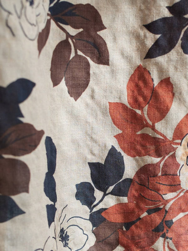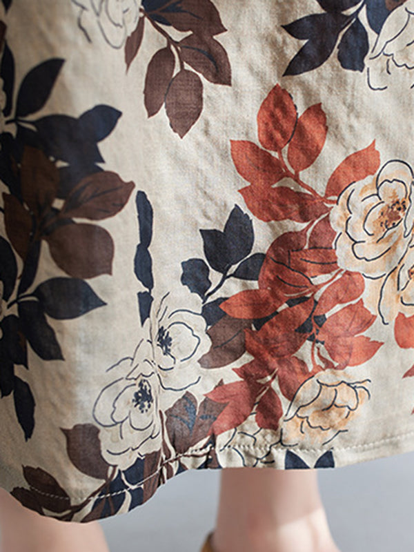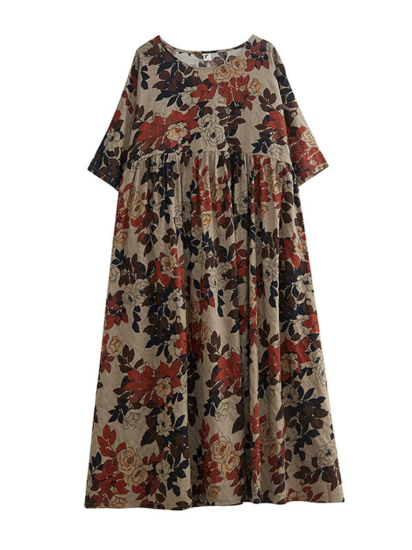 woloong Floral Printed Short Sleeves Puff Sleeves Round-Neck Midi Dresses