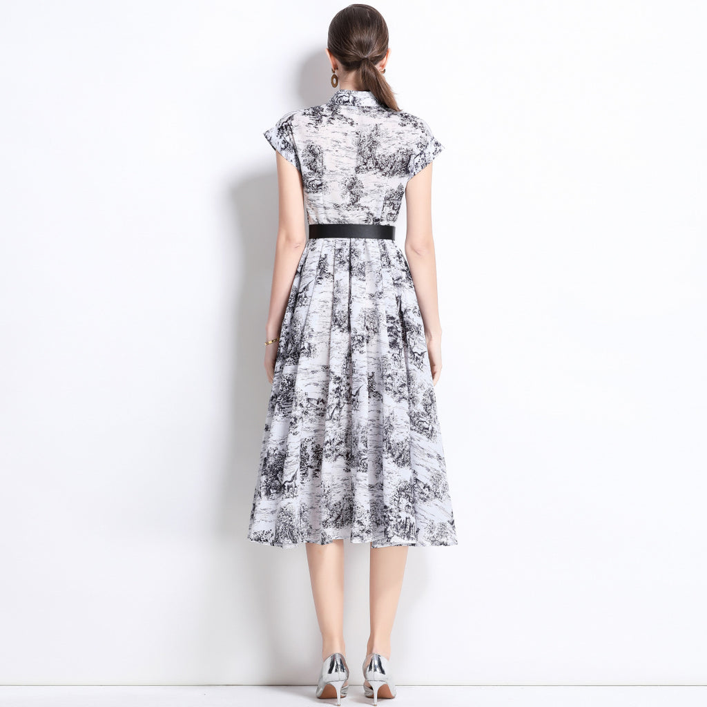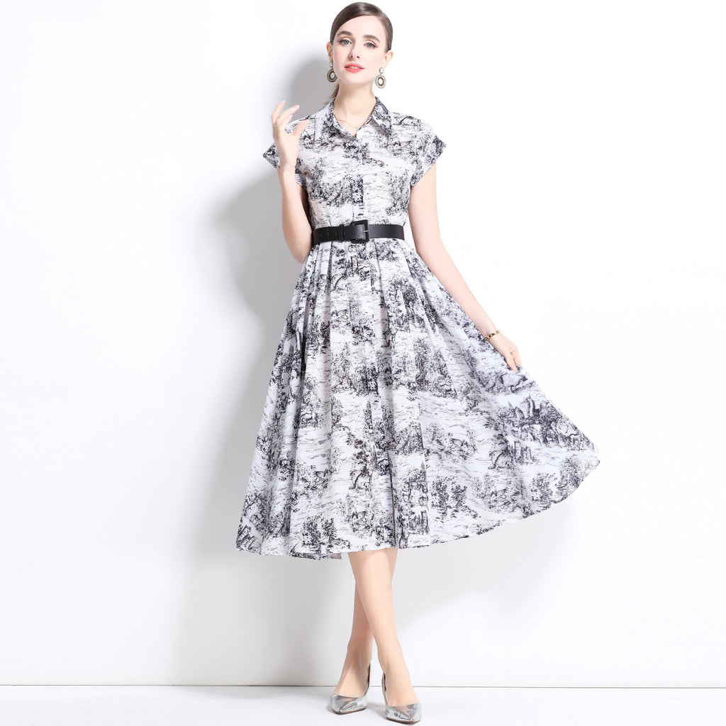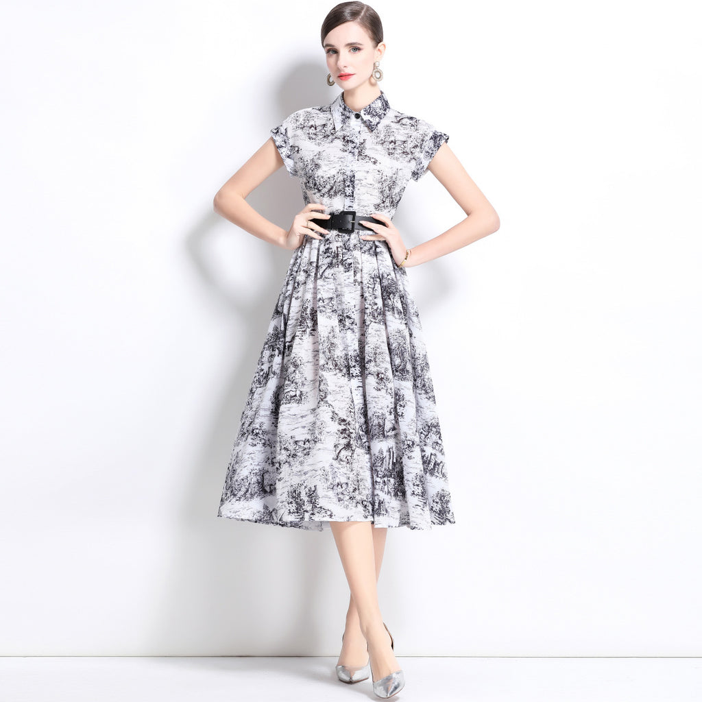 niche retro print dress women's fashion elegant lapel single-breasted waist and thin knee shirt skirt