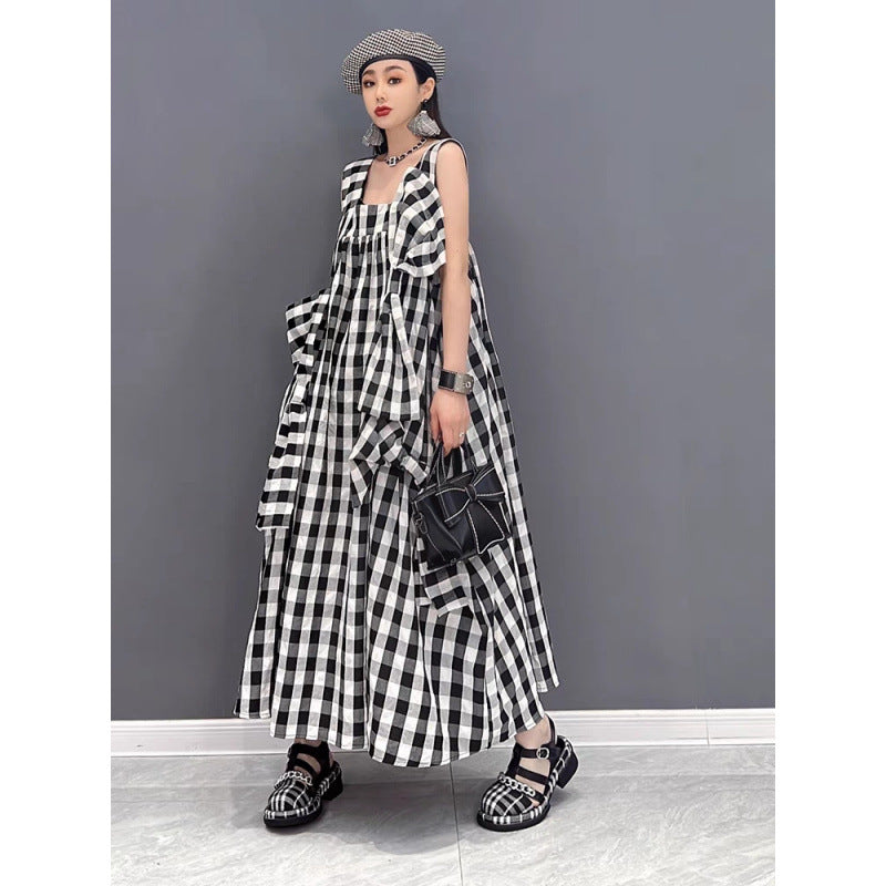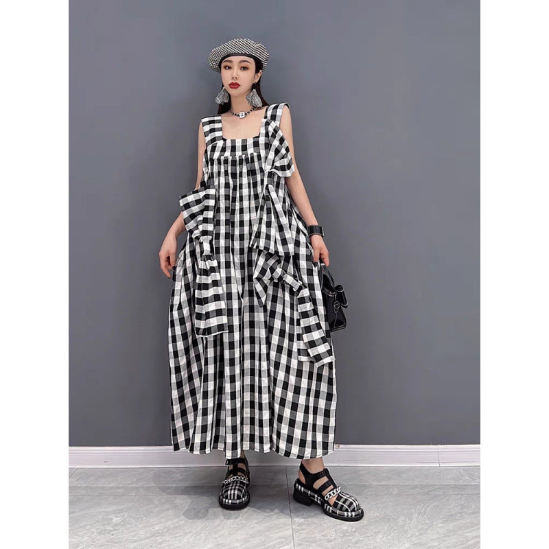 Popularan Station Summer New Fashion Dress Large Size Casual Cotton and Linen Suspender Plaid Temperament Women