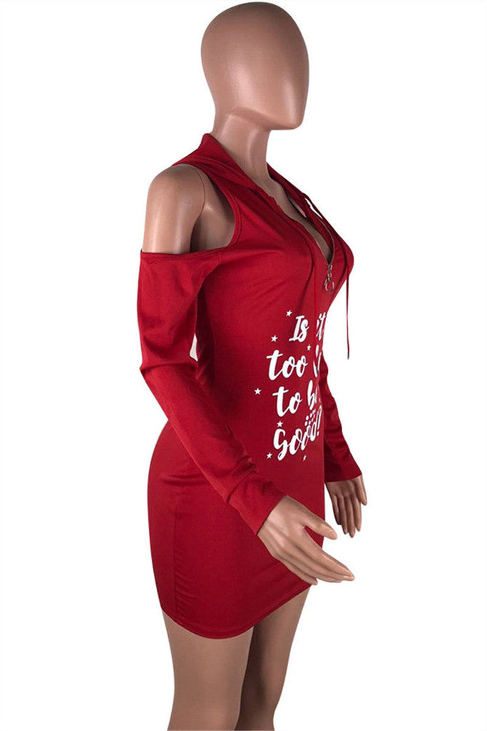 woloong - Red Fashion Casual Letter Print Hollowed Out Hooded Collar Long Sleeve Dresses