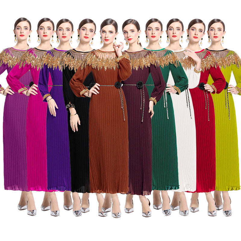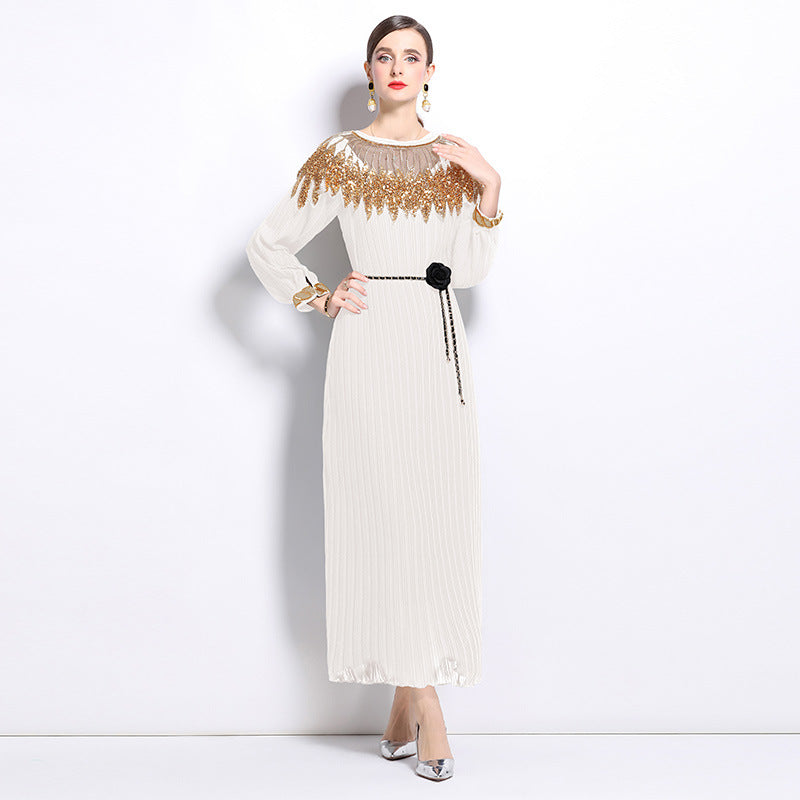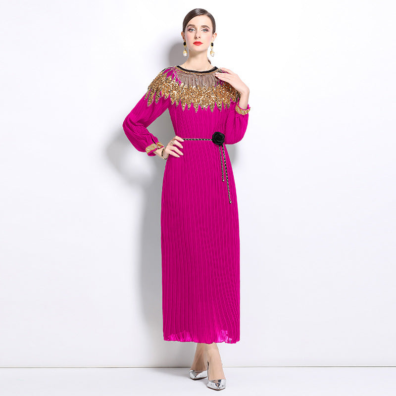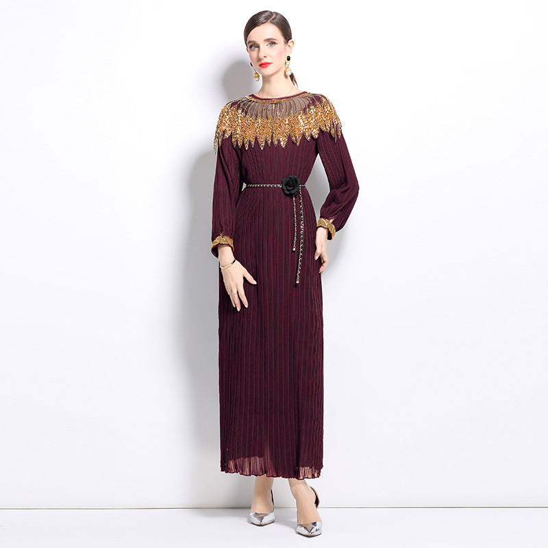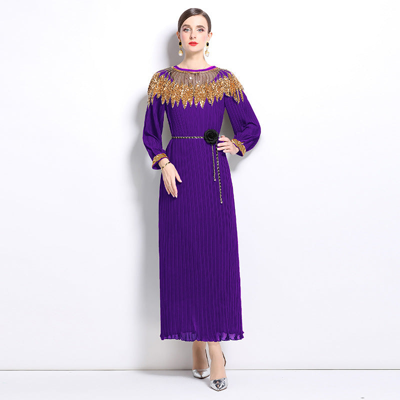 senior celebrity Fan Heavy Industry bead dress skirt temperament imperial sister Fan lantern sleeve pleated loose long dress