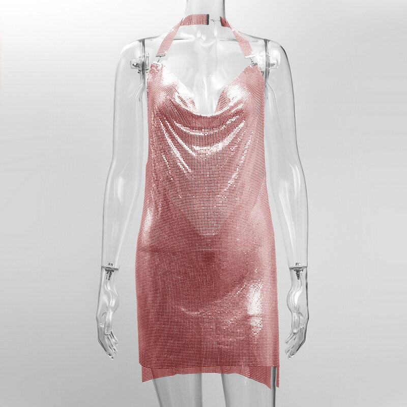 Shiny Luxury Sequined Low Cut Halter Mini Dress Backless Patchwork Split Sleeveless Hollow Out Party Sexy Women Solid Dresses