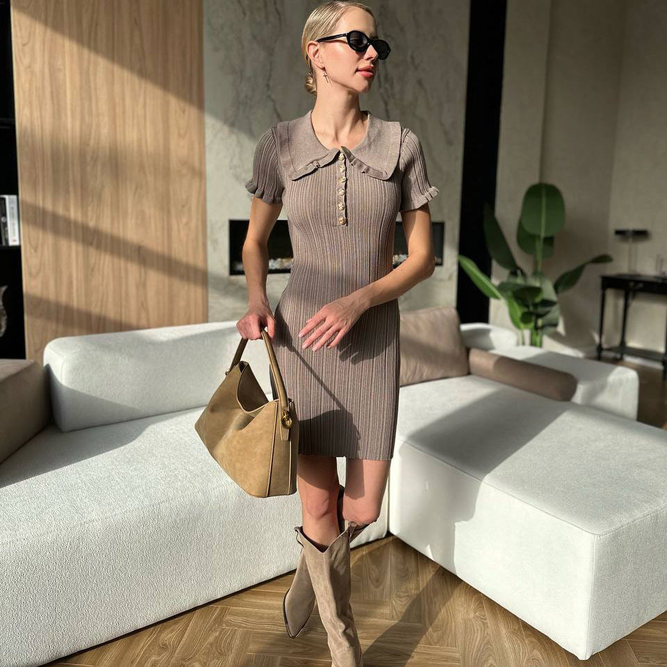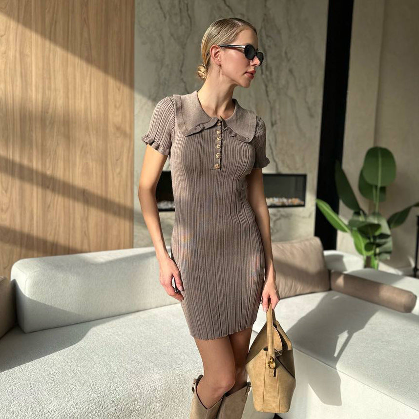 Slim-fit doll collar short-sleeved knitted dress three-dimensional twisted flower waist A-shaped skirt commuting casual and thin temperament skirt