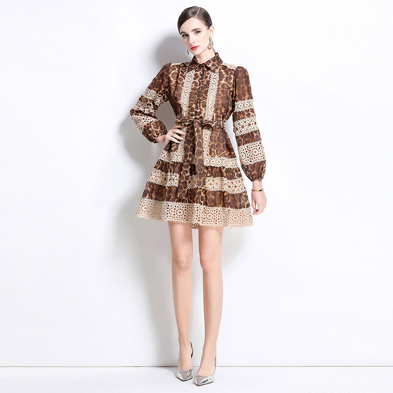 spring retro high-end long-sleeved new hollow lace splicing leopard print dress