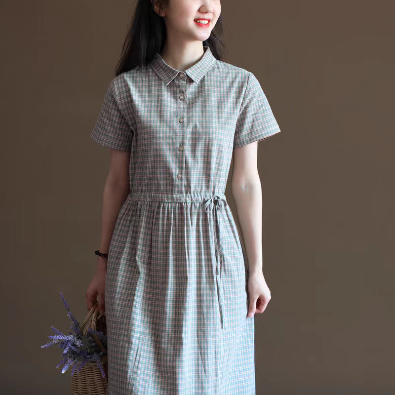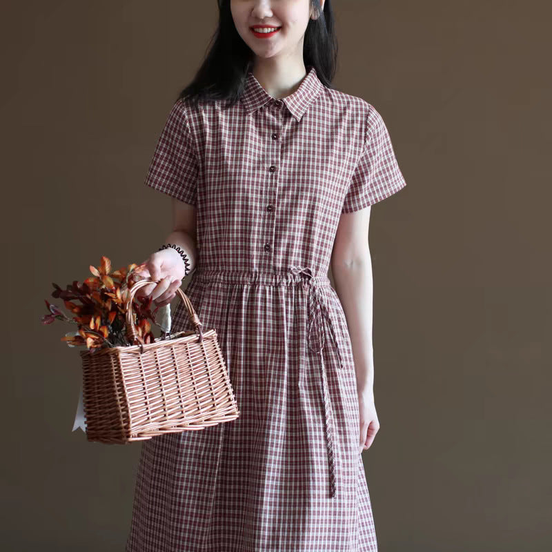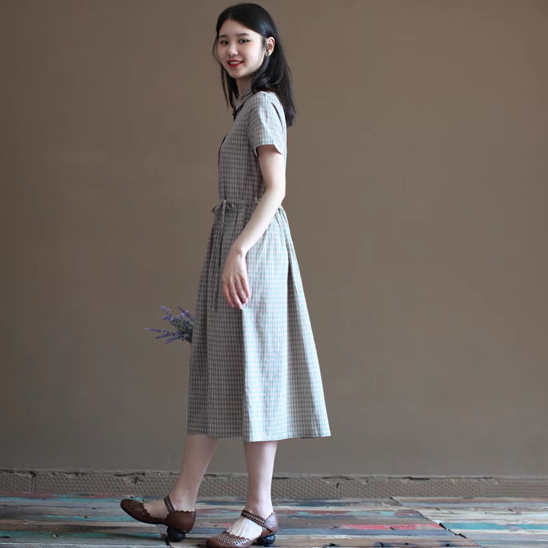 summer Mori retro literary temperament plaid shirt skirt lace-up waist Japanese medium and long dress women