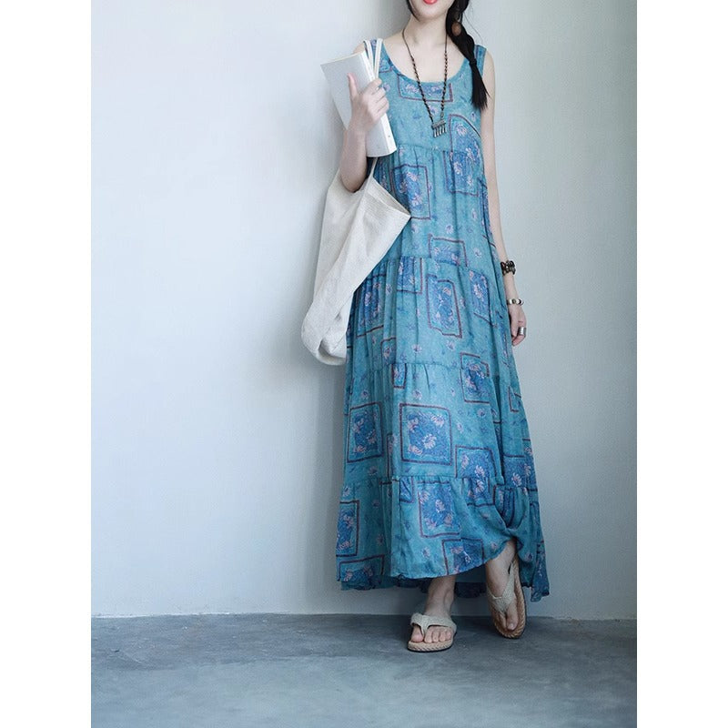 summer new retro literary and fresh loose suspender women's skirt printed loose large size vest dress