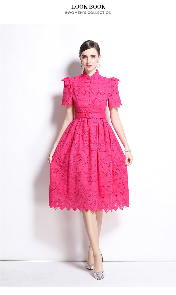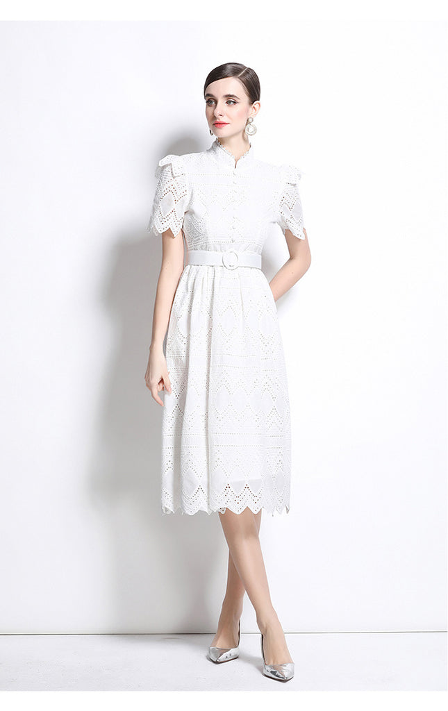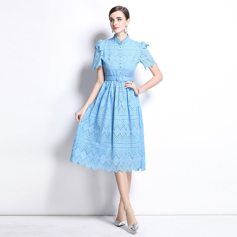 summer new retro niche stand-up collar ruffle edge splicing waist hollow embroidery short-sleeved dress