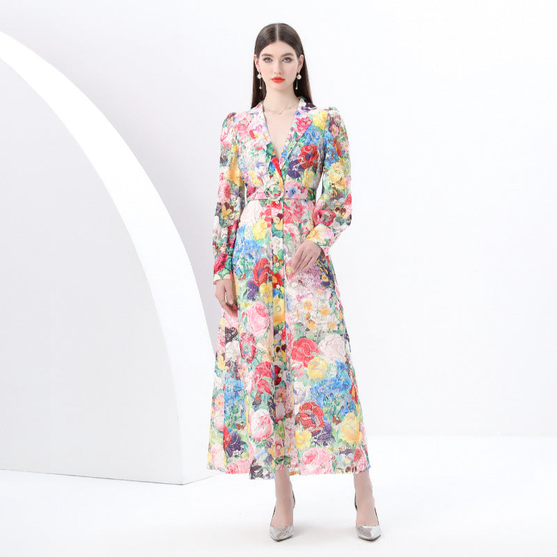 Women's Clothing Early Spring - Holiday Style Suit Collar Long Sleeve Wide Pendulum Lace Floral Print Long Dress