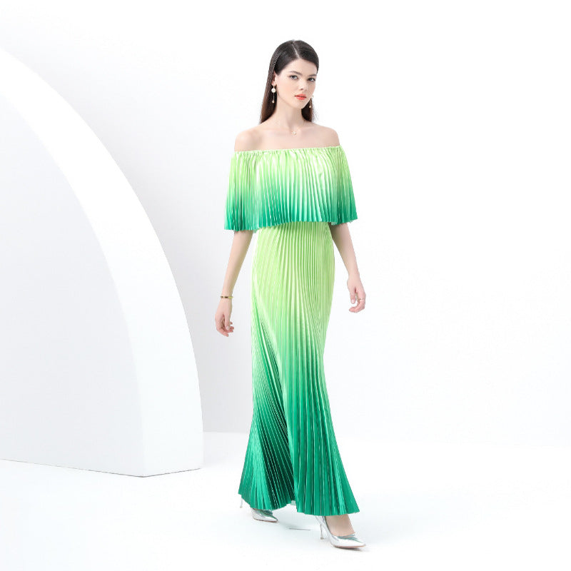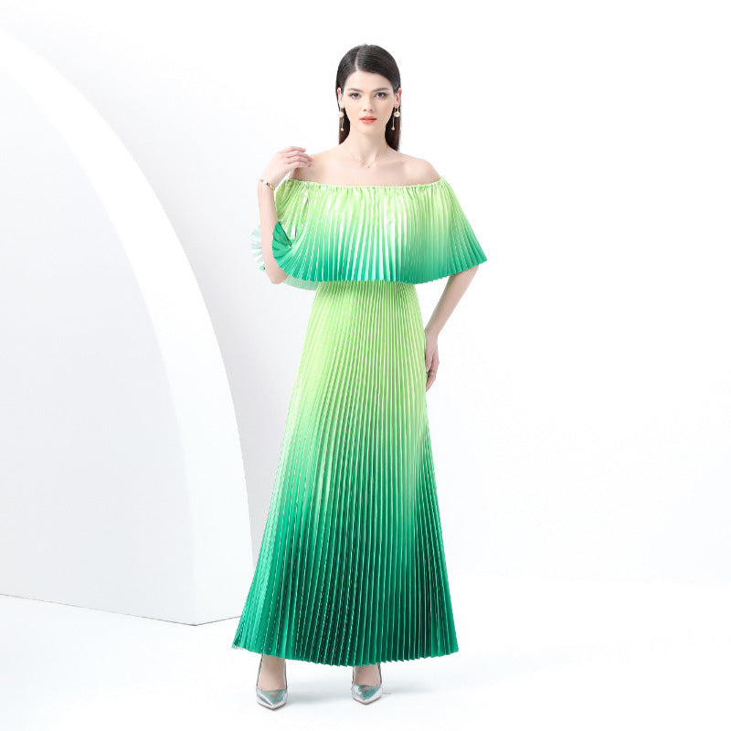 women's clothing early spring new gradual change holiday wind one-word shoulder ruffle edge holiday printing long dress