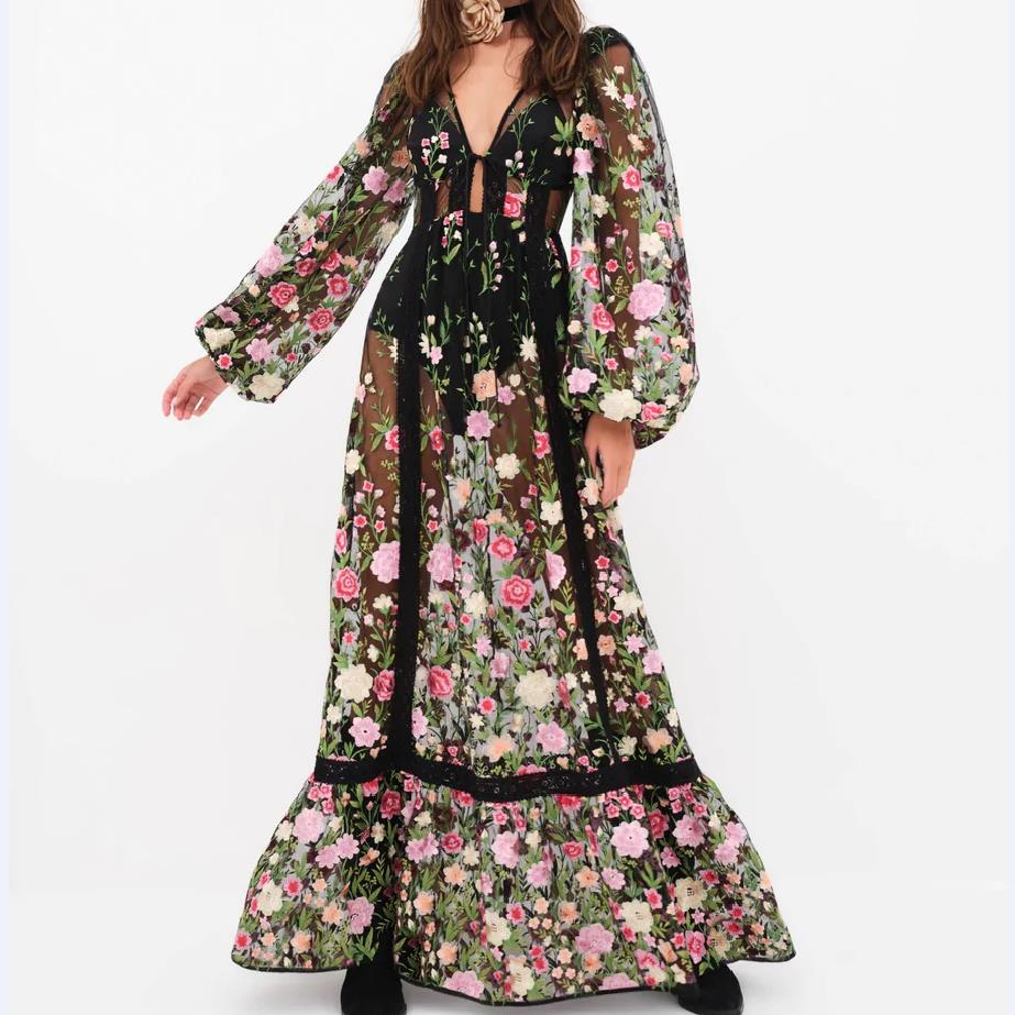 Women's Sexy Holiday Bikini Cover-Ups Beach Flower Embroidery Dress Long Sleeve Dress See Through Mesh Sheer Dresses