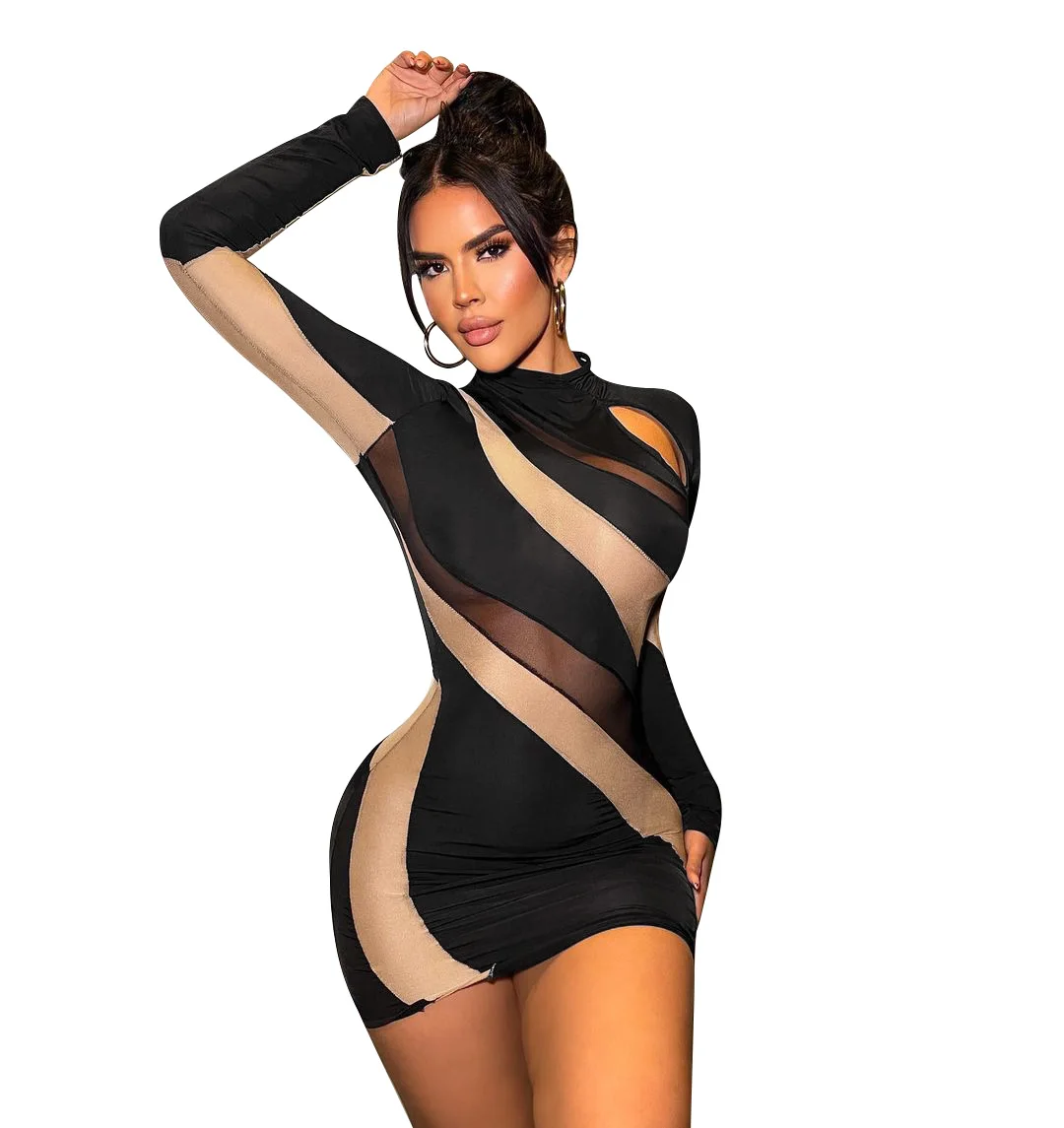 Matching Color Long Sleeve Hollow Out Sexy Slim Mini Dress Spring Women Fashion Outfit Streetwear Party Nightclub