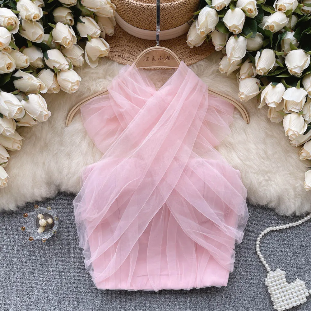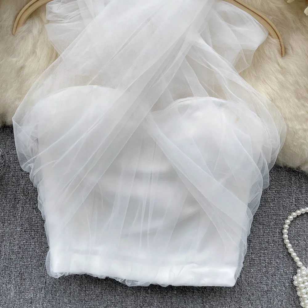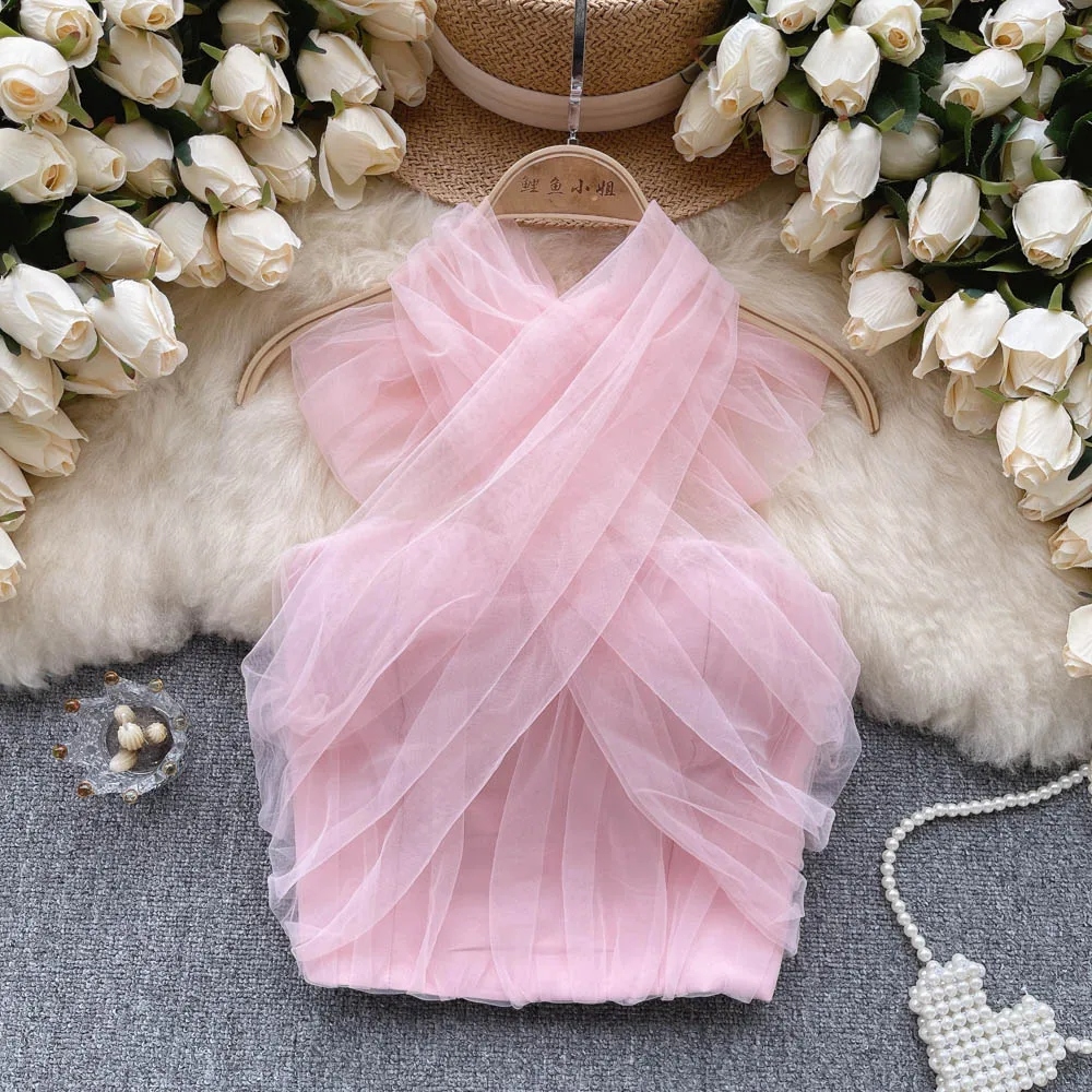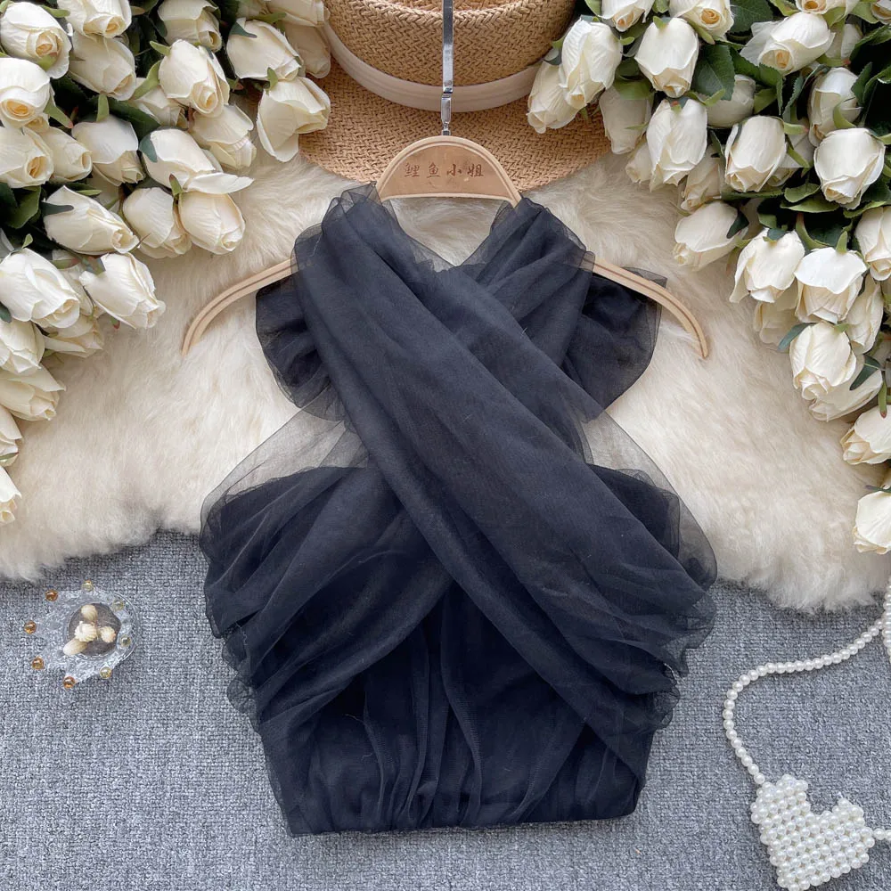 Women's Sexy Mesh Sheer Camis Hot Sweet Cross Bandage Fold RufflesTank Tops Summer Lacing Bow Off Shoulder Sleeveless Crop Top