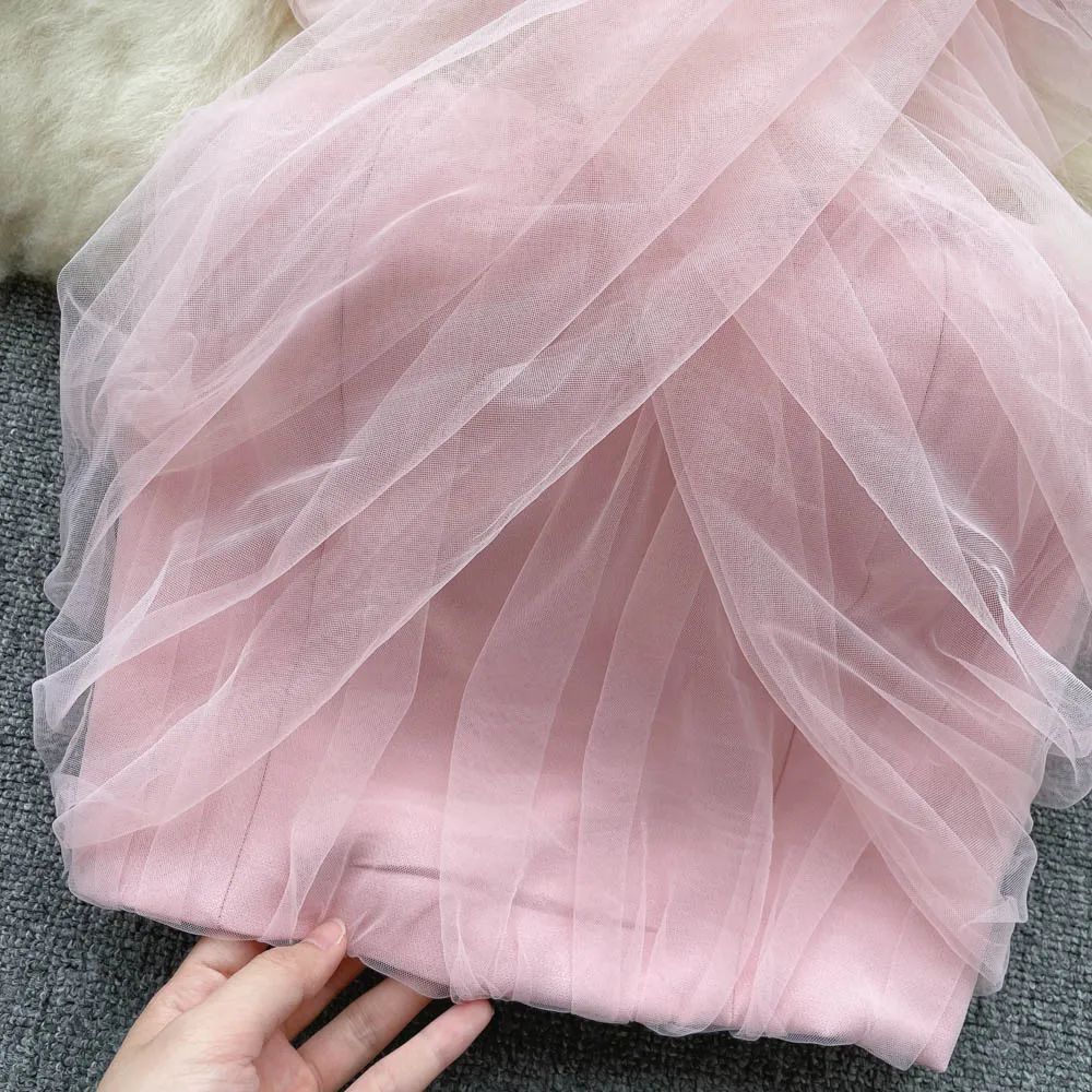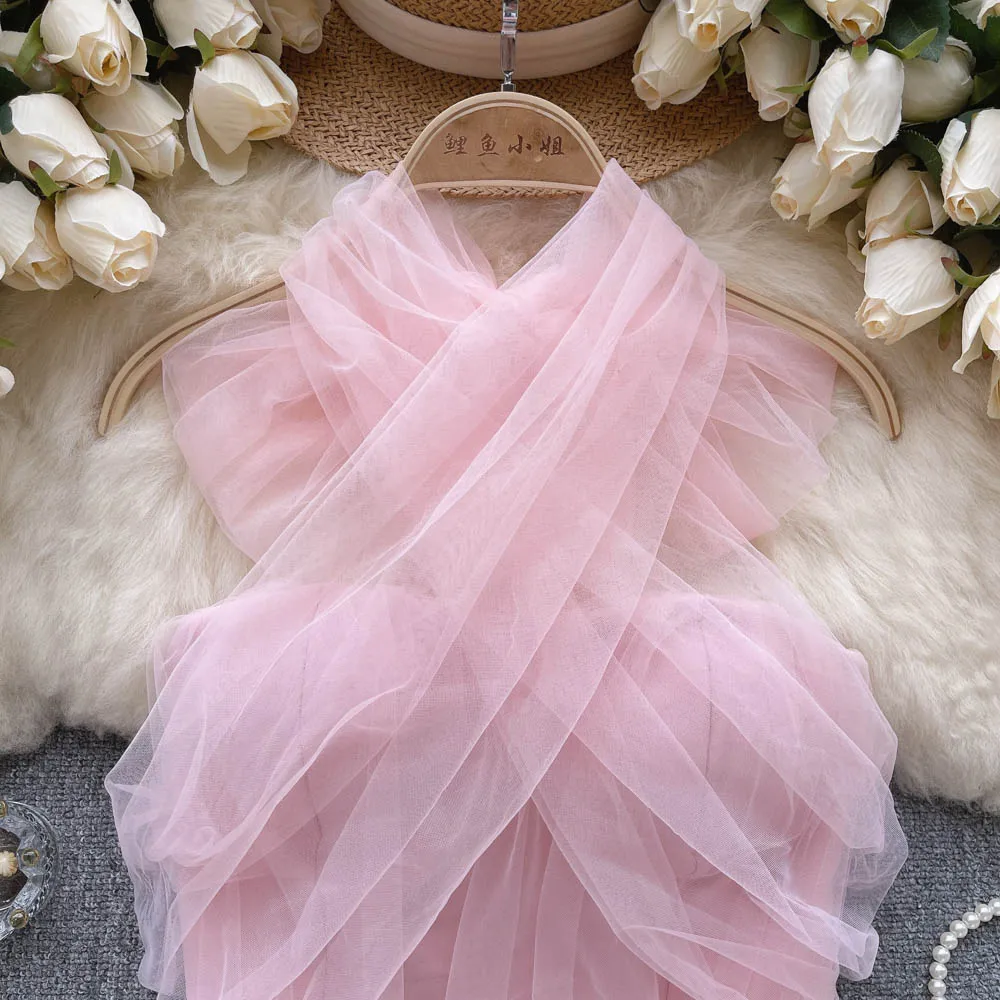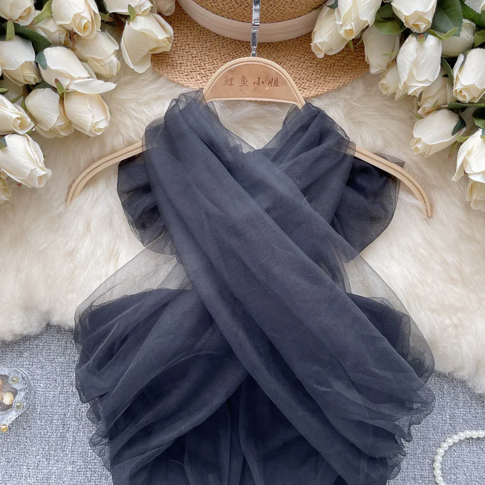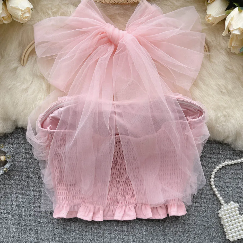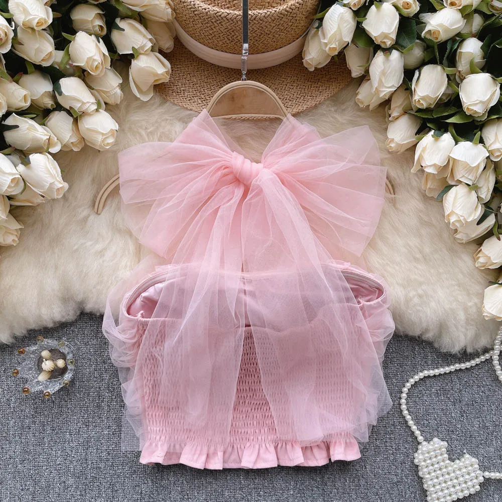 Women's Sexy Mesh Sheer Camis Hot Sweet Cross Bandage Fold RufflesTank Tops Summer Lacing Bow Off Shoulder Sleeveless Crop Top