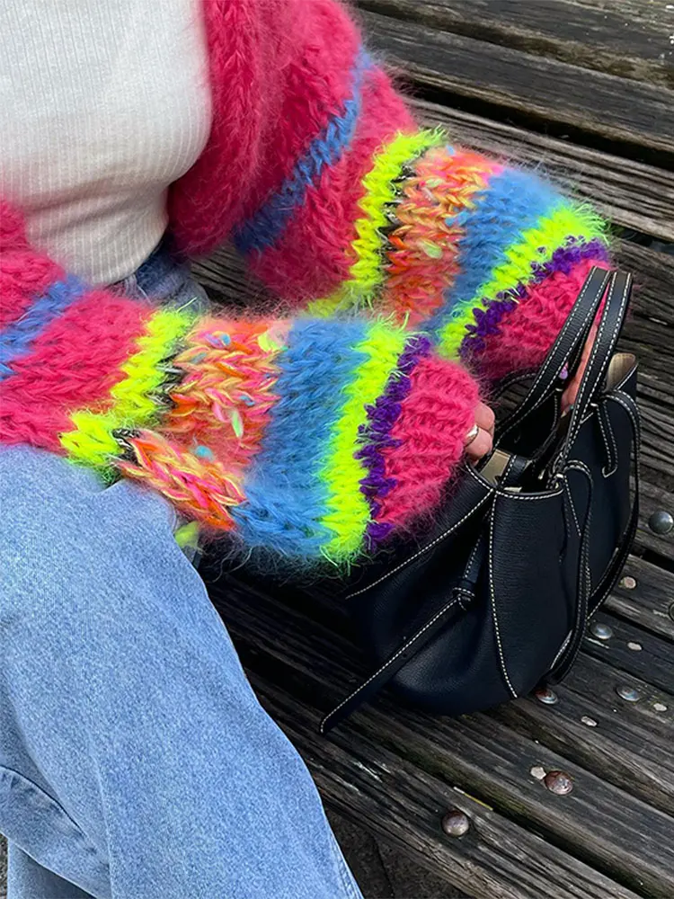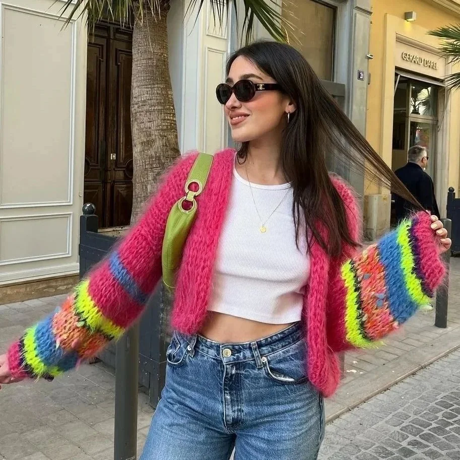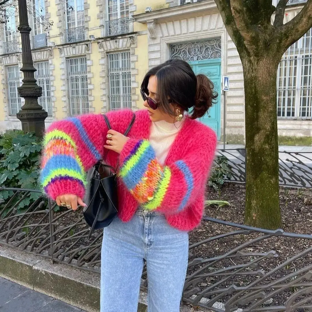 Women Striped Knit Splice Cardigans Autumn Winter Loose Full Sleeve Vintage Front Open Cropped Knitwear Ladies Casual Streetwear