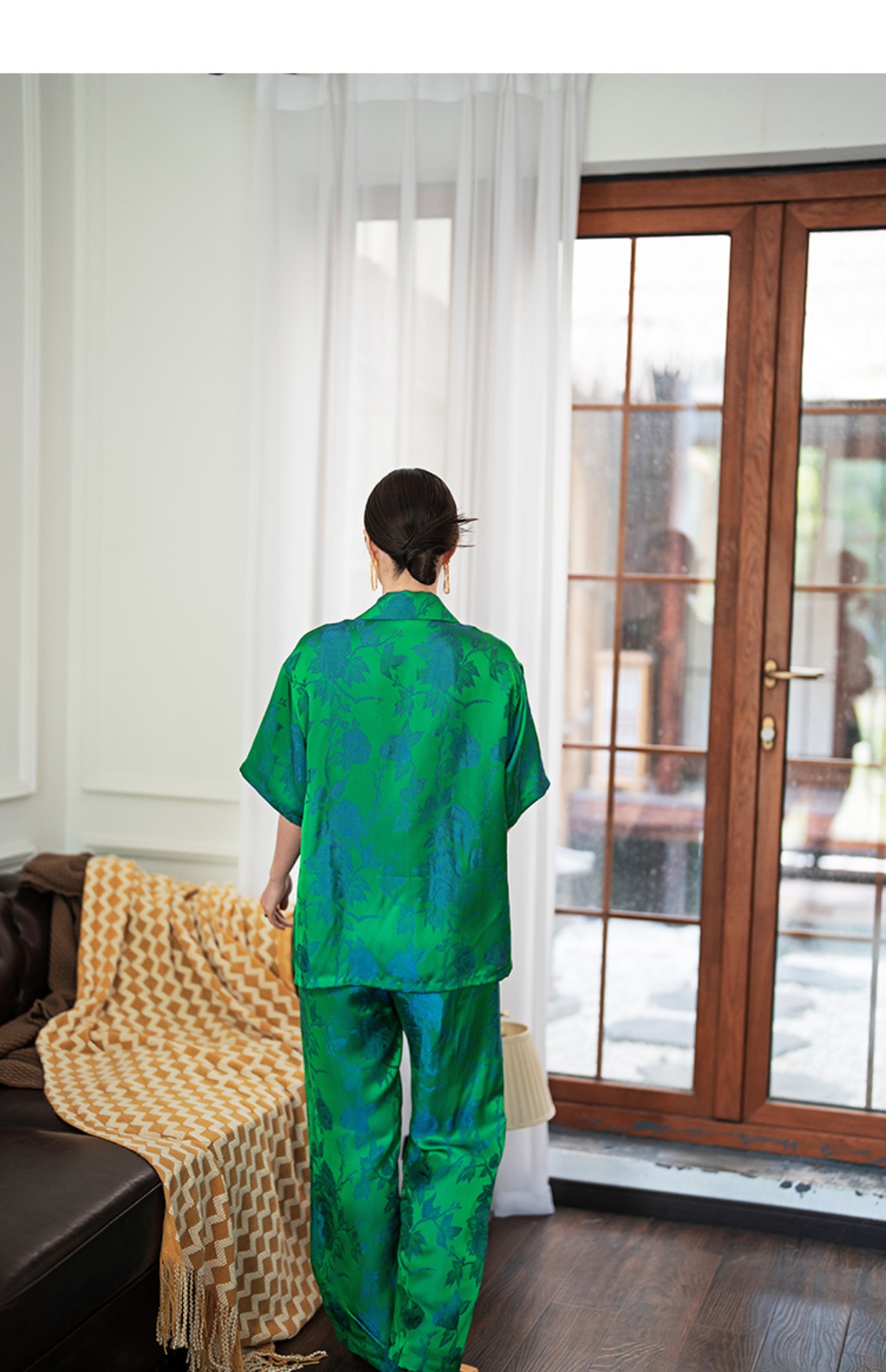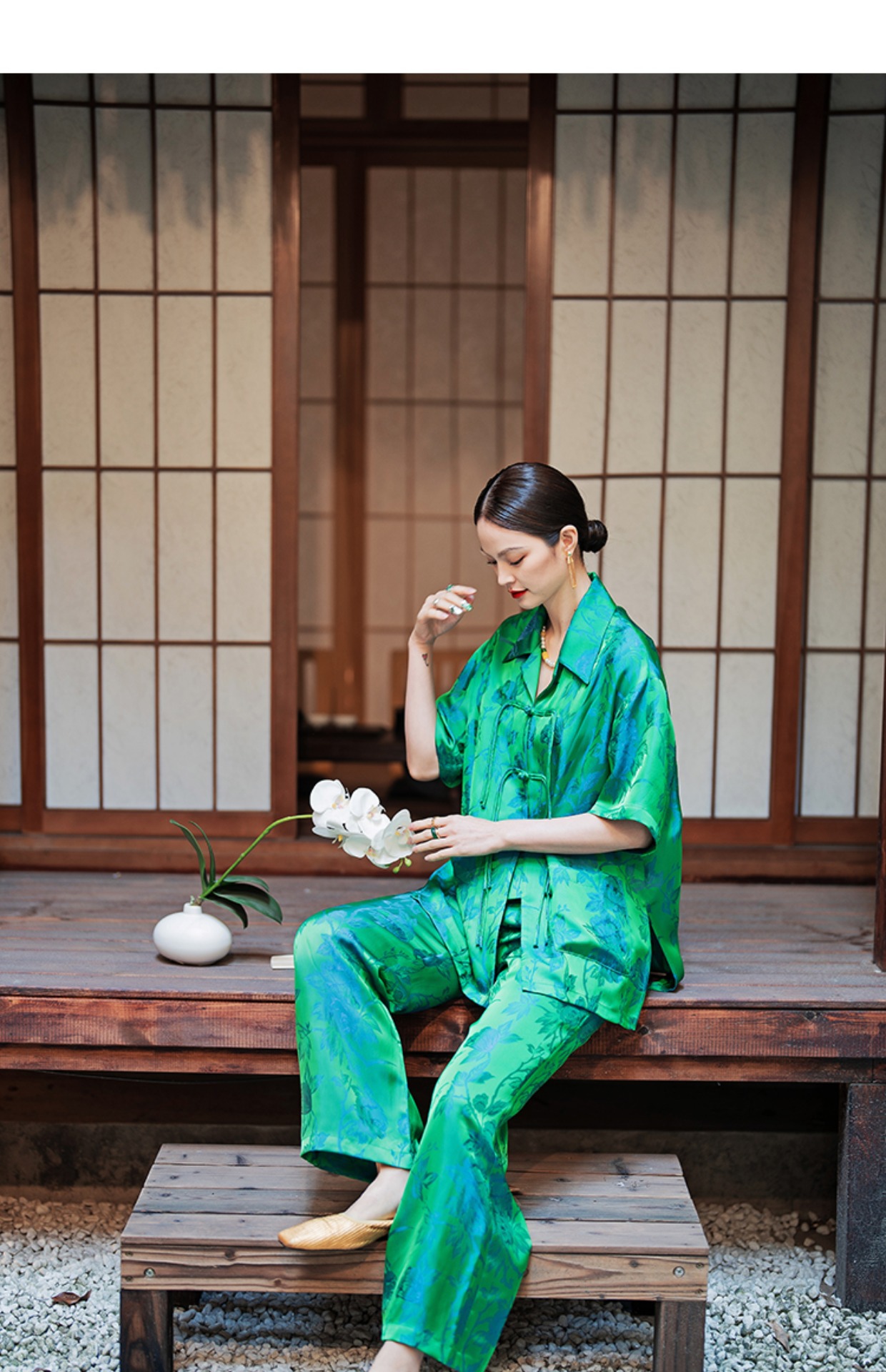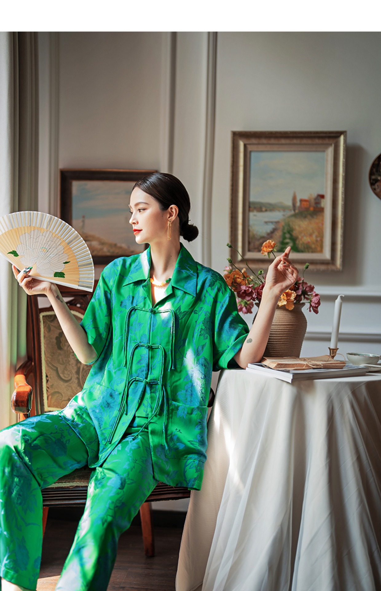 Autumn Luxury Satin Women Green Print Pajamas Set Half Sleeve Shirt Loose Pants Sleepwear Suit Ladies Office 2 Piece Sets Outfit
