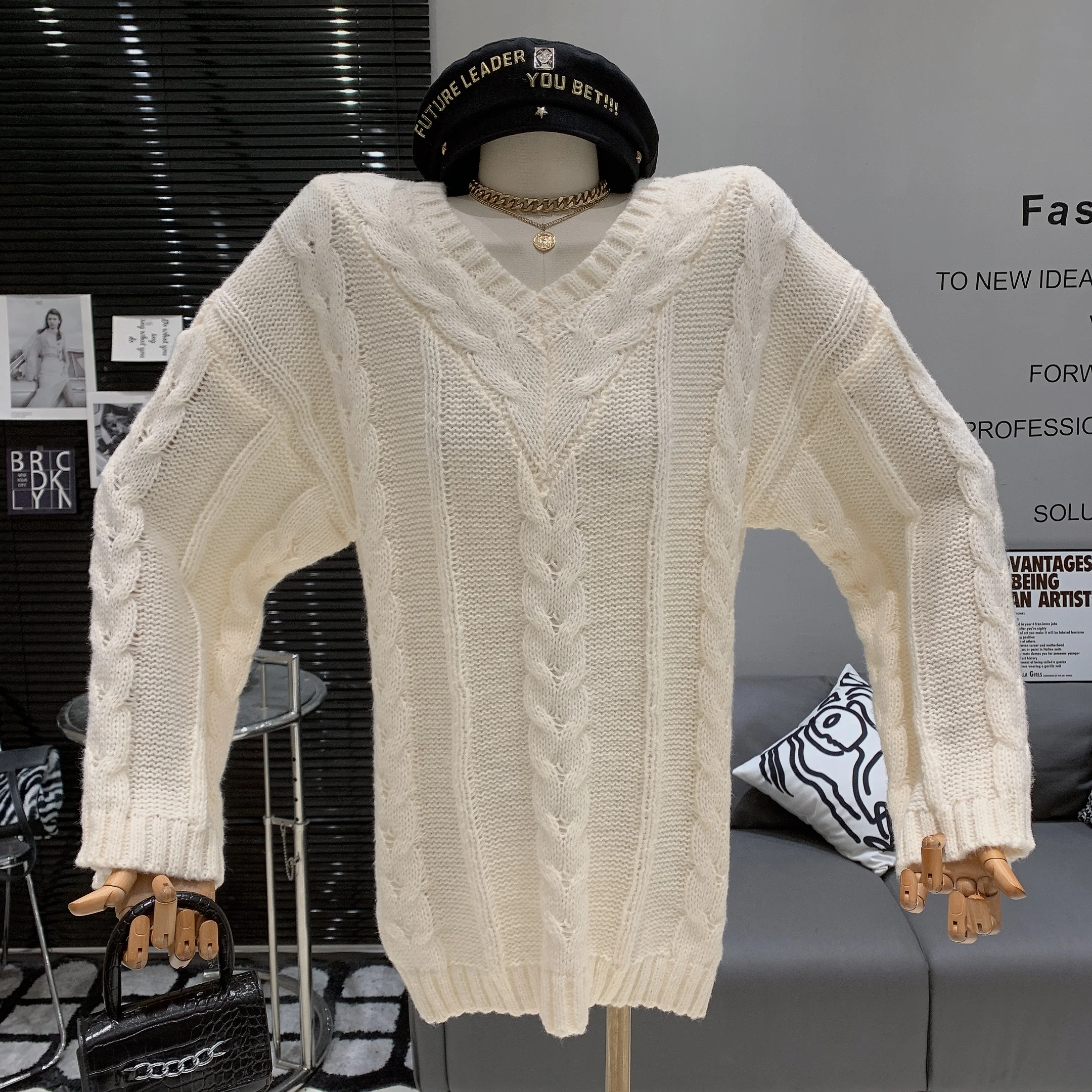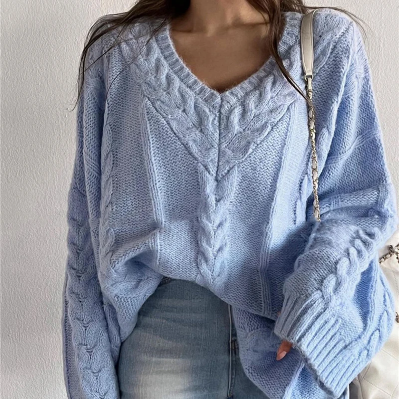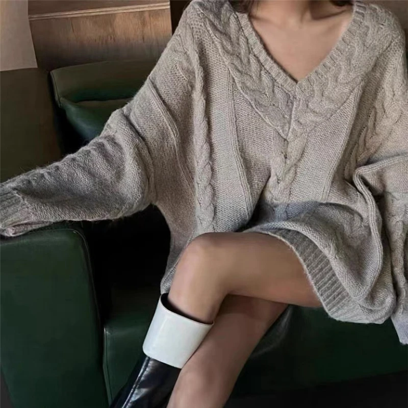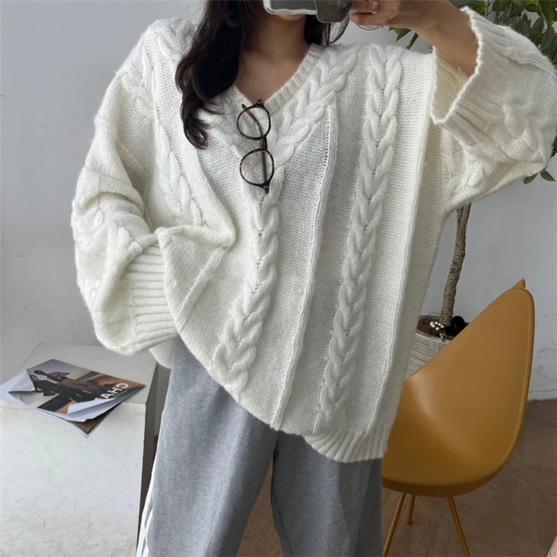 Black Friday Women's Oversized Cable Knit Sweater Long Sleeve V-Neck Pullover Jumper Fall Winter Knit Tops Light Blue Pink Korean Style