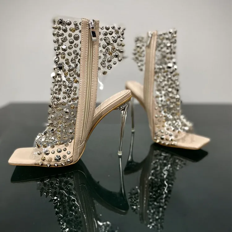 Brand Design New Crystal/rivet Zipper Sandals Stage Banquet Nightclub High Heels Women Shoes Apricot Silver Dress Matching