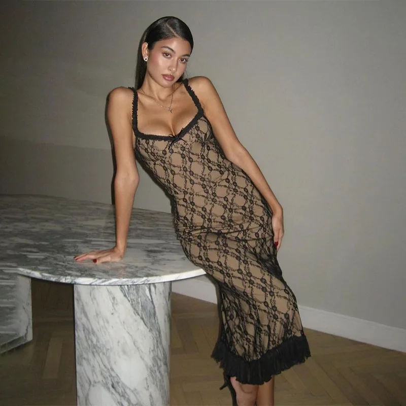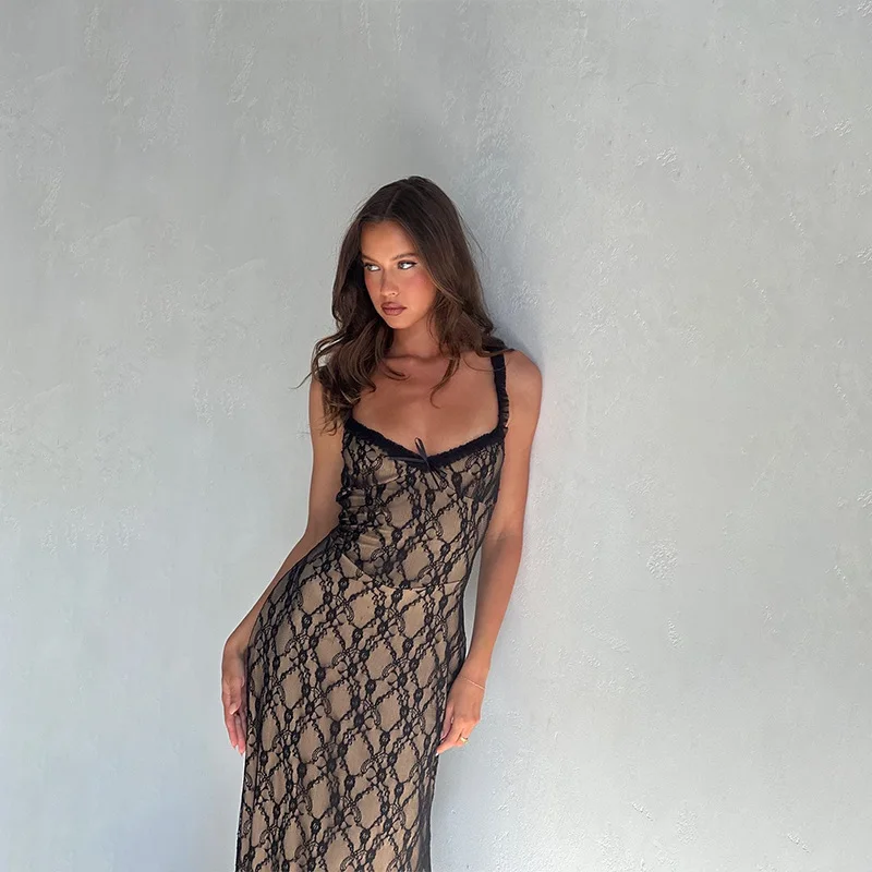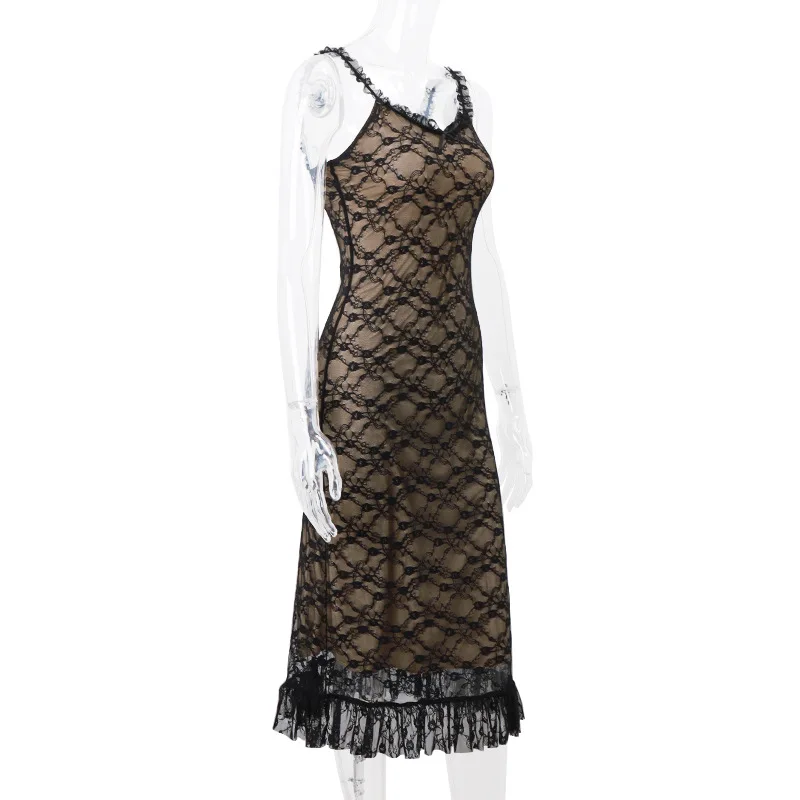Lace Patchwork Mesh Spaghetti Strap Sleeveless Midi Dress Ladies Elegant Party Clubwear Backless Slim Evening Dress