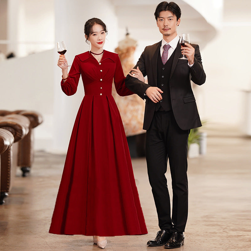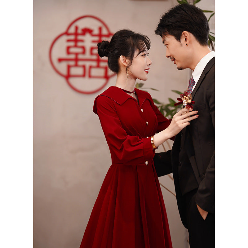 Large size toast dress bride new long-sleeved burgundy wedding engagement dress large lapel dress