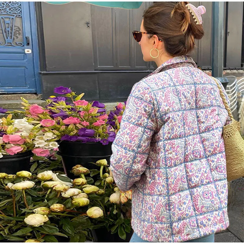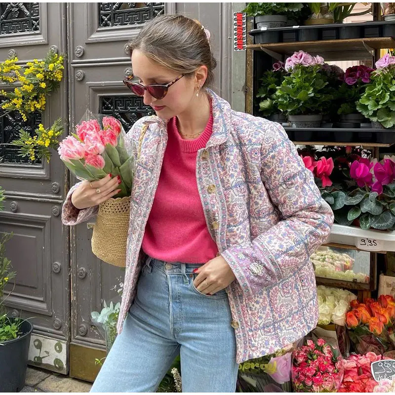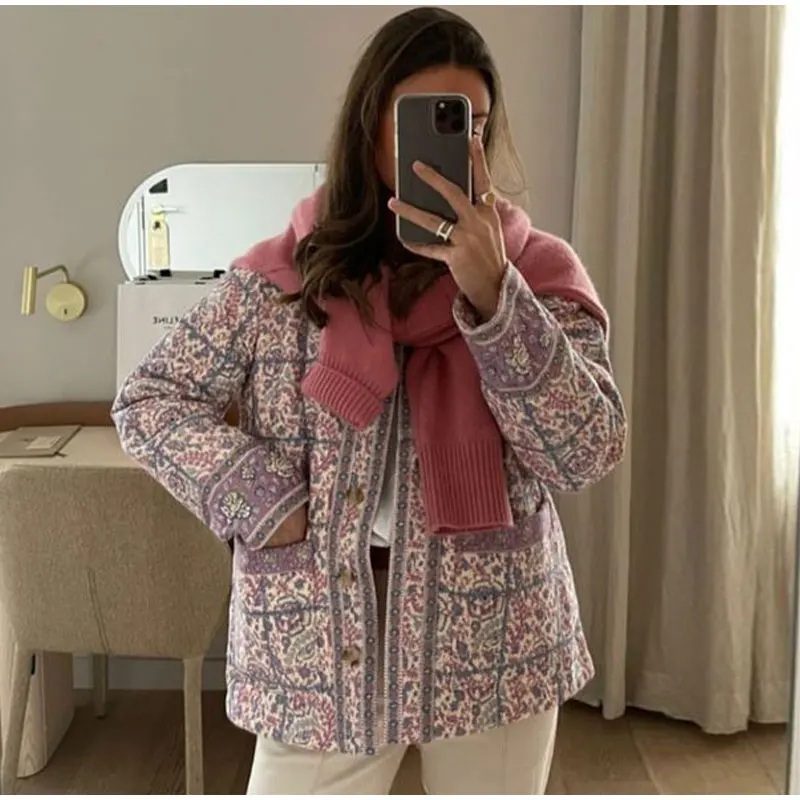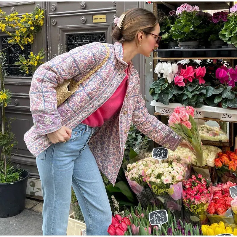 Vintage Printed Flower Cotton Jacket Women Long Sleeve Single Breasted Short Cardigan Autumn Chic Ladies High Streetwear