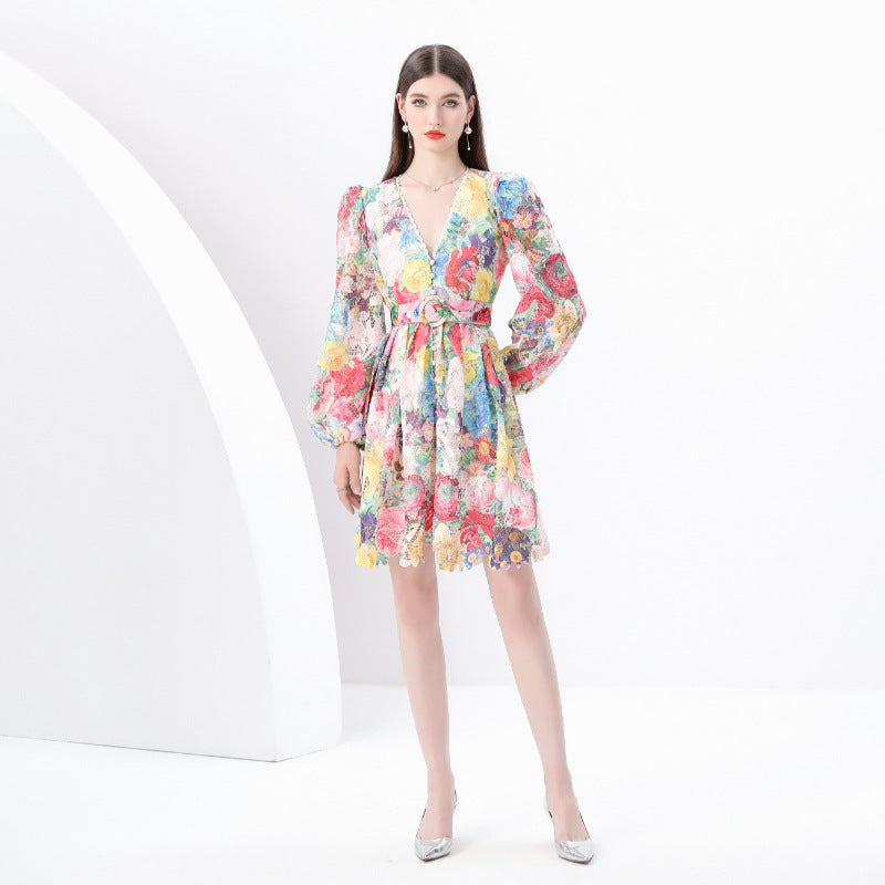 women's clothing early spring new painted retro V-neck single-breasted printed wide pendulum long dress