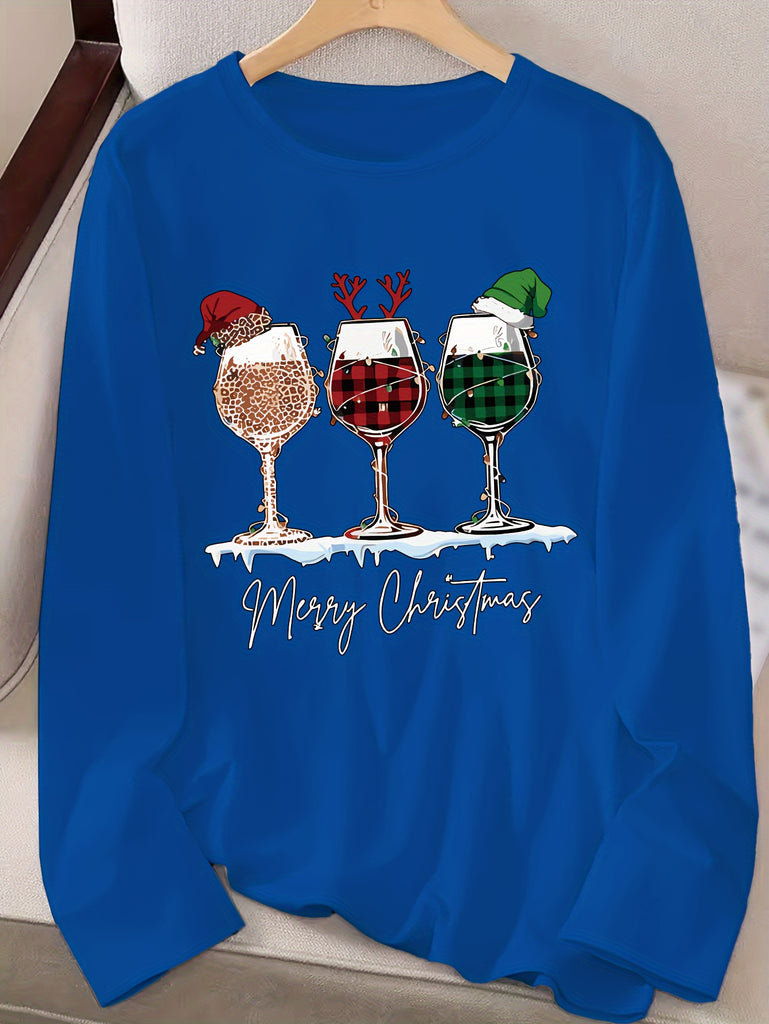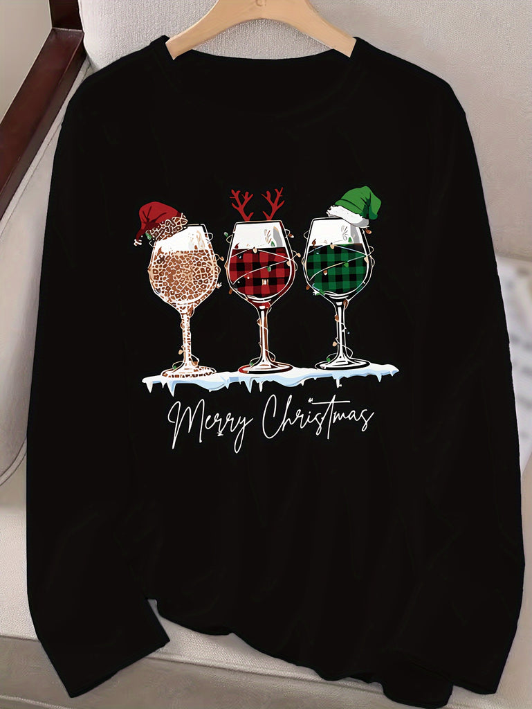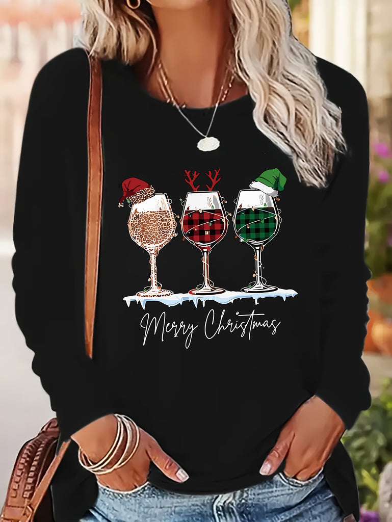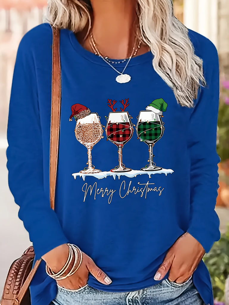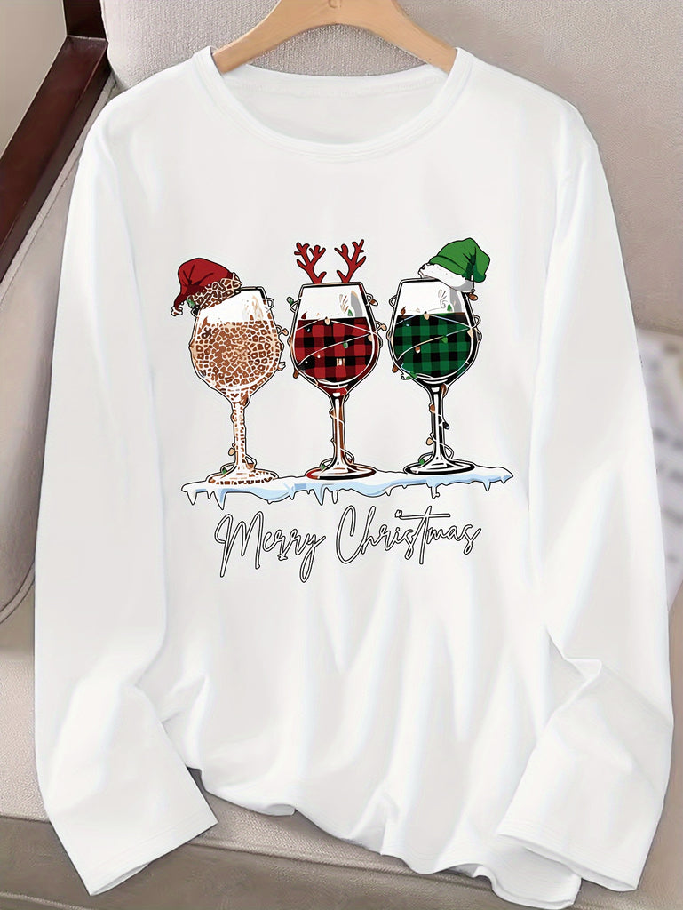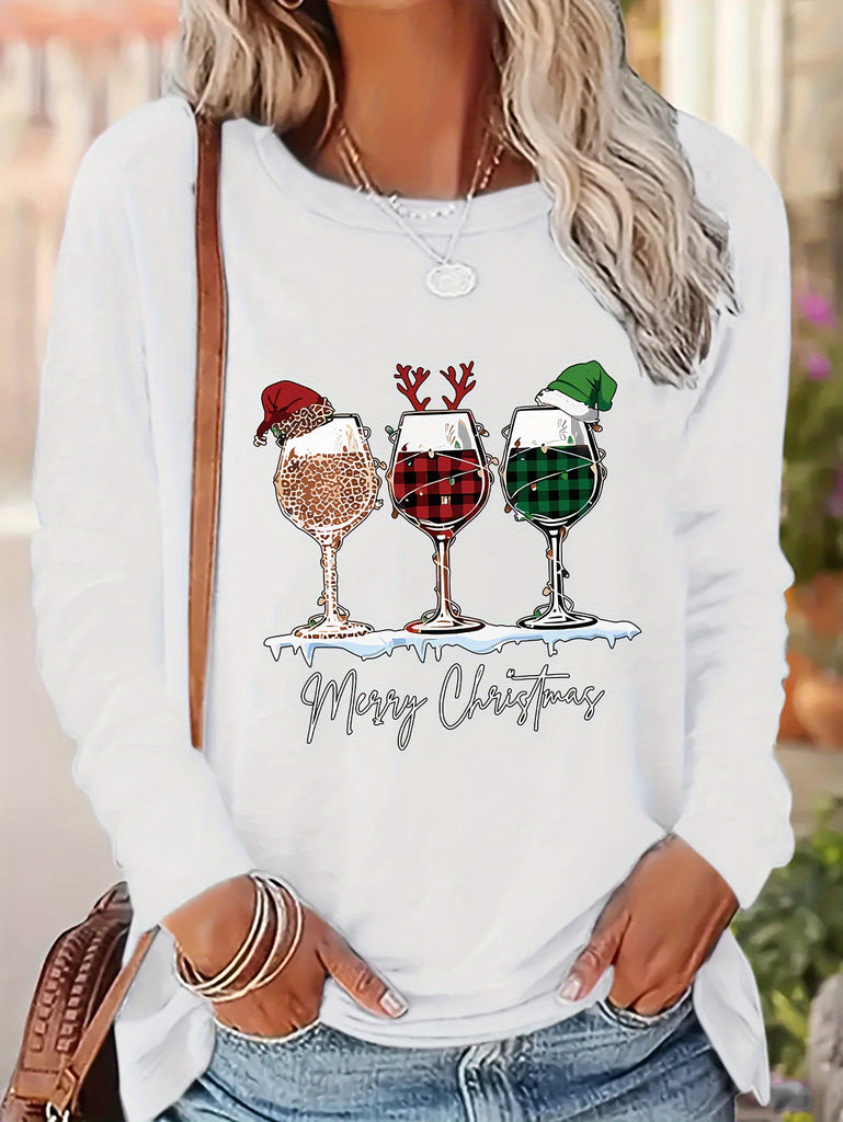 Women's Festive Christmas Wine Glass & Letter Print Long Sleeve T-Shirt - Casual Crew Neck, Polyester, Machine Washable